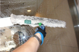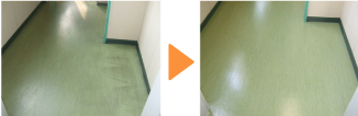 現在塗布されているワックスが黒く,もしくは黄色く汚れている場合はワックスそのものが汚れてしまっているためワックスの表面のみを洗う通常洗浄では、見栄えの大きな改善にならないことがあります。長年メンテナンスをしていない等、このような場合は、剥離(ワックスをはがして新しいワックスを塗布する)洗浄をされるのが望ましいといえます。